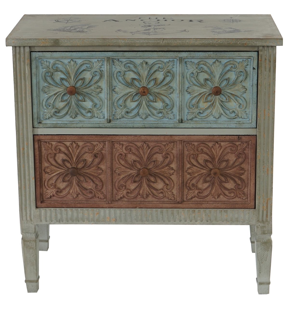 Está fabricada en madera maciza y con materiales de gran calidad. Fíjate en sus detalles: los motivos marinos en la encimera superior, el tallado con motivos florales de los cajones, su original combinación de colores...